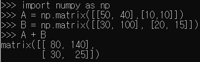 ② A = np.matrix([[80, 140], [30, 25]]) ← 하루 총 횟수인 A 행렬을 입력