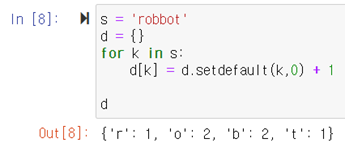 - d.setdefault(k,0) + 1 : 키(k)와 값(0)을 setdefault에 저장하라