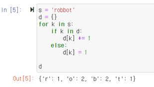 - d[k] += 1: r을 불러옴. R은 0이라고 디폴트값을 지정