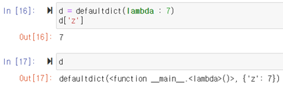 - d = defaultdict(int) : default method를 int 함수로 지정