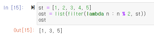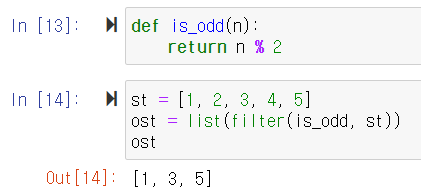 - ost = list(filter(is_odd, st)) : is_odd를 기준으로 st에 저장된 값들 중 일부 걸러 냄