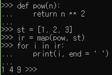 - 이를 통해 리스트 st에 저장된 값들의 제곱해 해당하는 값들이 만들어짐