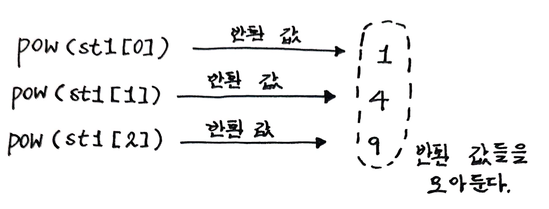 - 즉, st1에 저장된 값의 수 만큼 pow 함수가 호출되며, 그것이 pow 함수가 하는 일