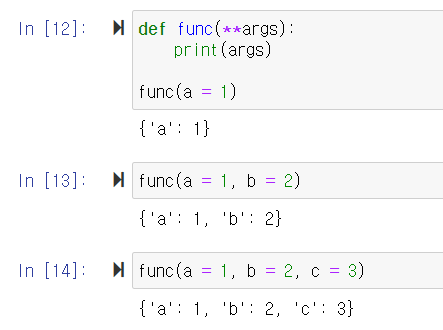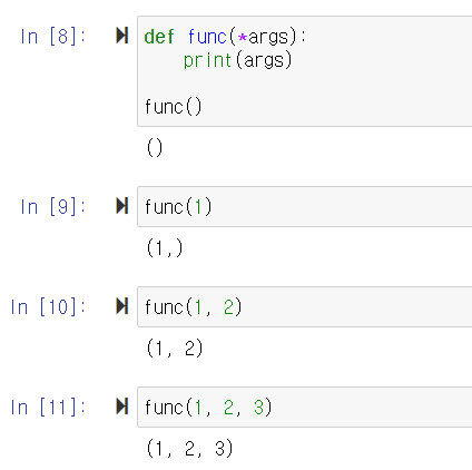 | def func(*args) | 값들이 튜플로 묶여서 args에 전달된다. |