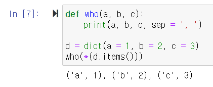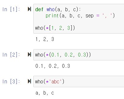 - who(*(0.1, 0.2, 0.3)) : 튜플을 풀어서 매개변수에 각각 전달